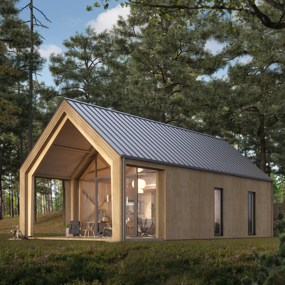 Ērti un mūsdienīgi – dzīvojamā māja, kuru iespējams uzbūvēt un uzstādīt 6 mēnešu laikā no pasūtīšanas brīža. Pārdomāts un funkcionāls plānojums ar ergonomisku telpu izvietojumu. Papildus mājīgajām koka sijām un koka apdarei, projekta augstie griesti un lielie logi, padara telpas plašas un gaišas.